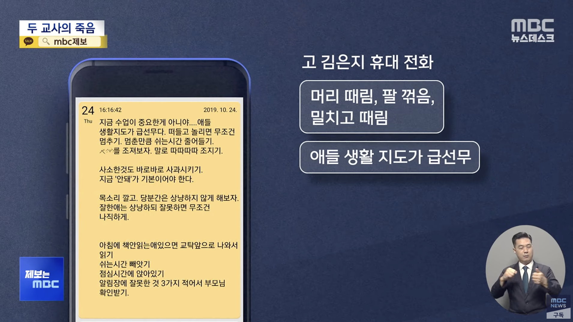 김은지 교사 부모 : "학생들이 서로 뺨 때리면서 막 치고받고 싸우는 걸보고 애가 충격을 먹어서... 그 뒤로 집에 와서 자기 침대에 앉아서 계속 '그러면 안돼. 그러면 안돼.."