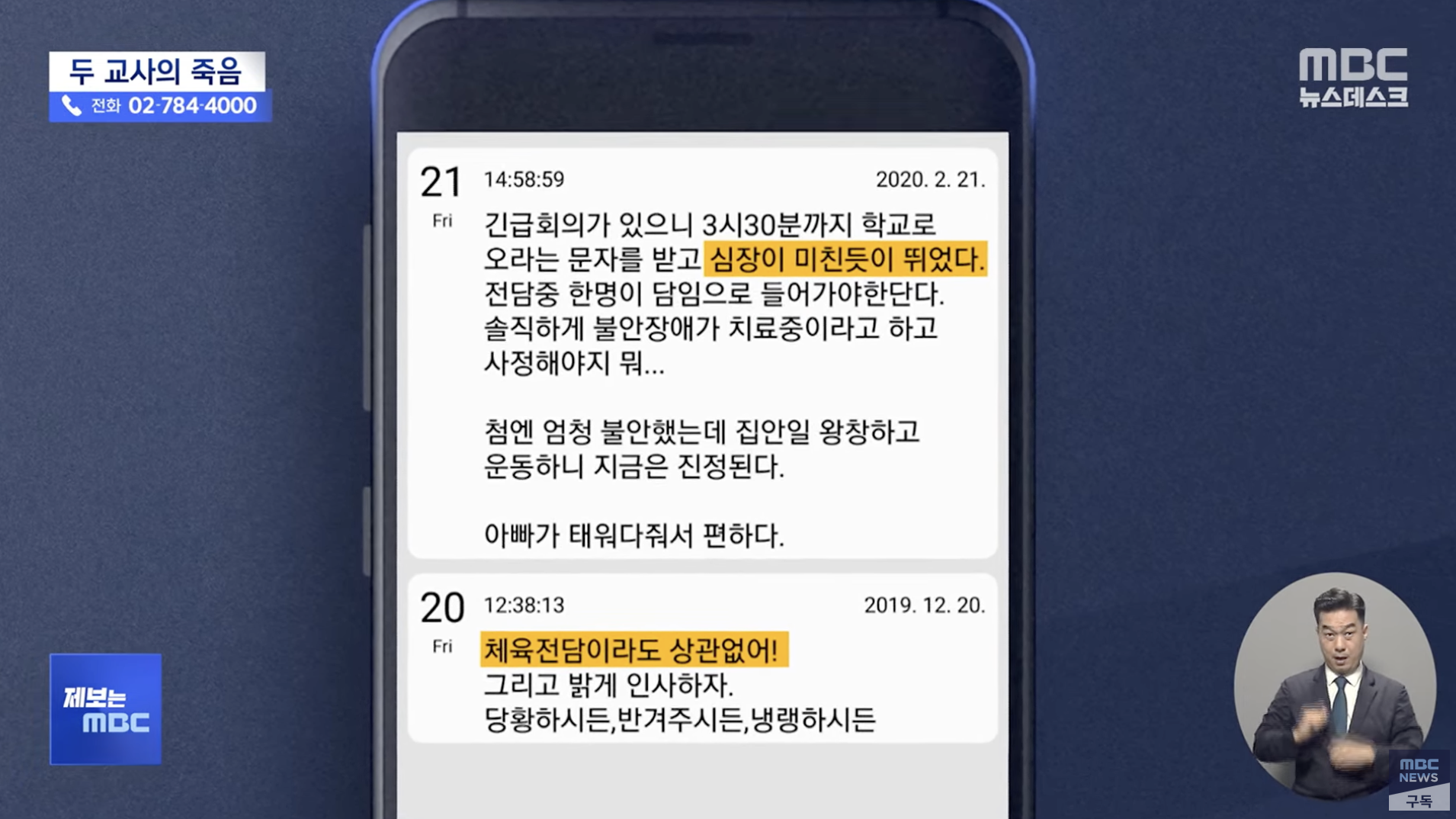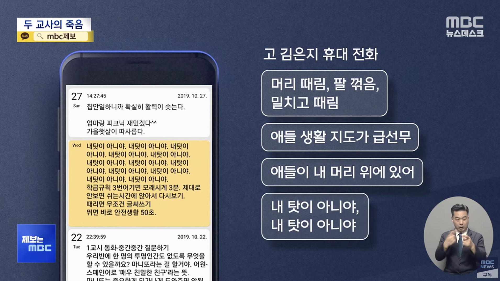 그리고 다음날 새벽, 이영승 선생님은 '이 일이랑 안 맞는 거 같다. 하루하루가 힘들었다'는 마지막 글을 남기고 스스로 생을 마감했습니다. 초임교사 2명이 6개월 간격으로 목숨을 끊었는데도, 경기도교육청은 mbc 취재 전까지 이 사실을 몰랐고 학교가 교육청에 보고한 사망원이는 두 명 다 단순 추락 사고였습니다.